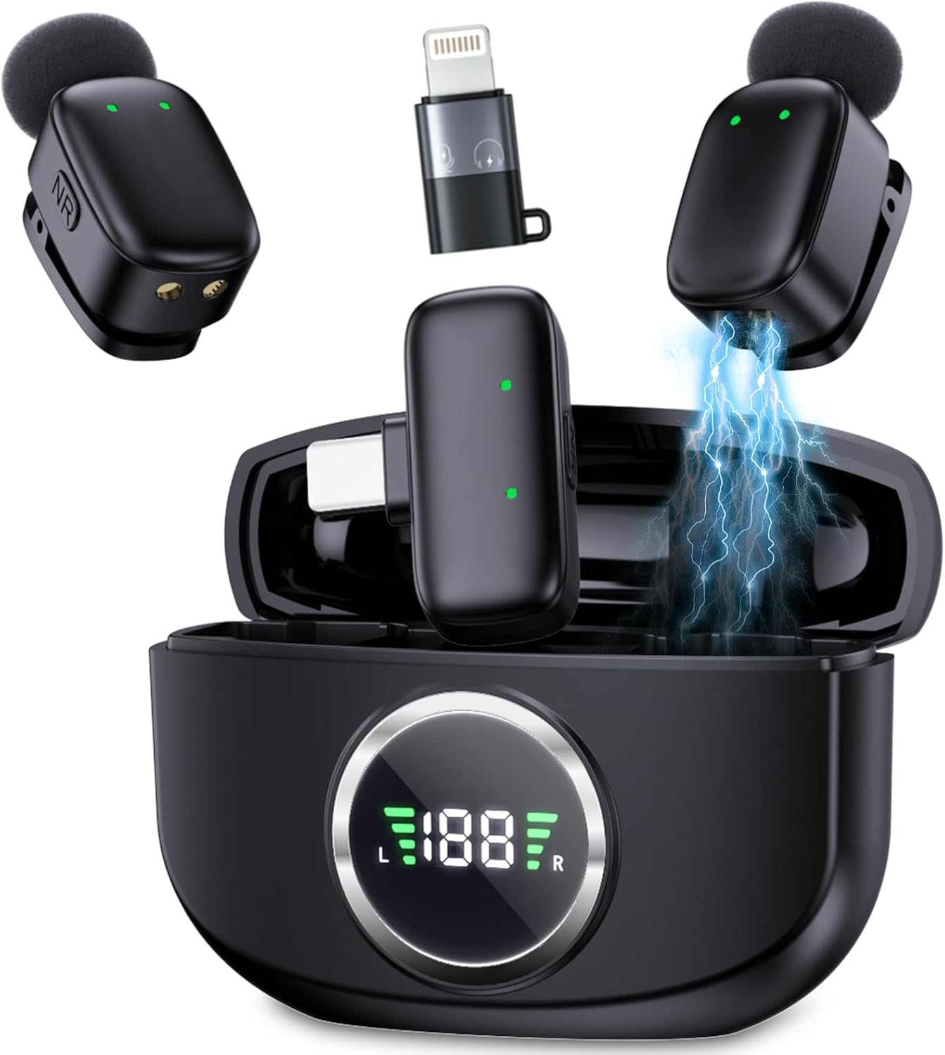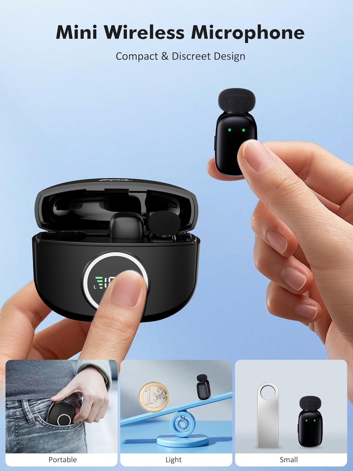 Product description:5g Ultralight Mini Mic:Weighing just 5g,the lapel mic clips securely to clothing while remaining effortlessly concealable and virtually undetectable during use. Focus fully on your performance with stylish comfort, free from clothing wrinkles. The pocket-sized charging case ensures ultimate portability for on-the-go recording