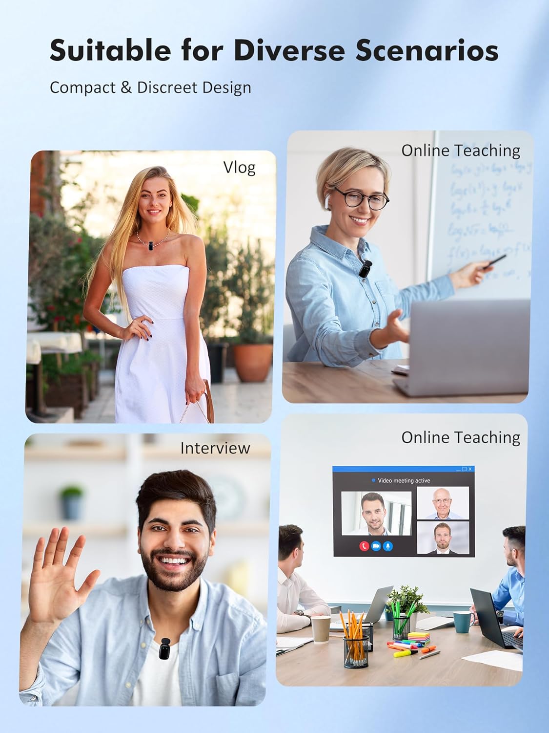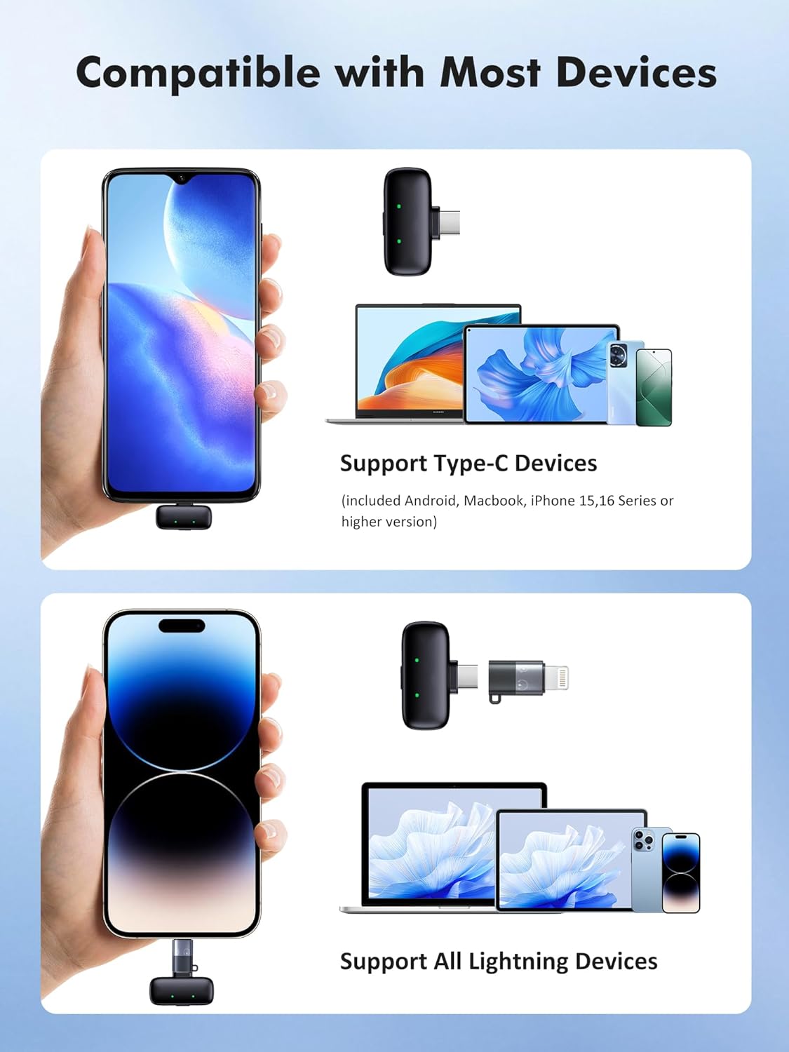 Universal compatibility: The portable microphone includes a Type-C receiver and Lightning adapter, compatible with , Android, cameras, and computers. This wireless lapel microphone is suitable for a variety of different scenarios, such as live streaming (Facebook, YouTube, TikTok), vlog recording, interviews, online meetings, video teaching, blogging, etc