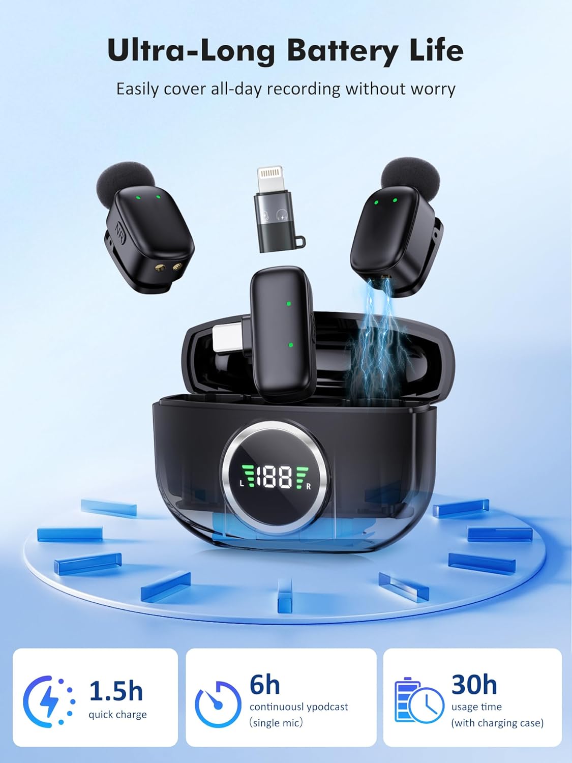 ● 30-Hour Total Battery: A single mic can operate for 8 hours on a full charge. When used with the charging case,the mobile version has a battery life of 30 hours, meeting all-day recording needs. The receiver supports USB-C real-time charging, and the battery compartment is equipped with a digital display screen, allowing you to intuitively check the battery level at any time, eliminating battery concerns